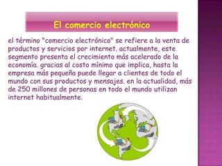 El documento habla sobre el comercio electrónico y sus diferentes modalidades como B2C, B2B y C2C. Explica que el comercio electrónico permite realizar transacciones de bienes y servicios a través de medios electrónicos como Internet. También menciona algunos ejemplos exitosos de compañías de comercio electrónico como Google, eBay y Paypal.
