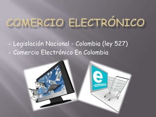 Este documento trata sobre el comercio electrónico en Colombia de acuerdo con la ley 527. Explica que el comercio electrónico es una metodología moderna para mejorar la forma de realizar actividades empresariales mediante el uso de la tecnología. Define conceptos clave como mensaje de datos, comercio electrónico y firma digital según la ley. También discute cuestiones jurídicas como la validez de transacciones electrónicas y la prueba de contratos.