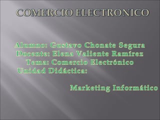 El documento habla sobre el comercio electrónico, que consiste en realizar transacciones comerciales de forma electrónica e incluye diversas actividades como la venta de bienes y servicios en línea, transferencias electrónicas de fondos, subastas y más. Ofrece ventajas para empresas como la reducción de costos, alcance global y disponibilidad las 24 horas, y para clientes como precios más bajos, mayor información y conveniencia. Sin embargo, también plantea riesgos como el desconocimiento de la empresa que vende, la seguridad de los