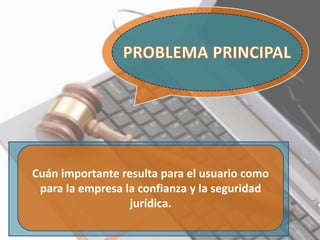 Este documento discute la importancia de la confianza y seguridad jurídica para los usuarios y empresas en los contratos electrónicos. Define el contrato electrónico y explica que no requiere la presencia física simultánea de las partes, sino que su consentimiento se da a través de equipos electrónicos. También describe algunas ventajas de los contratos electrónicos como el consentimiento claro de las partes, un objeto cierto y determinado, y una causa válida.