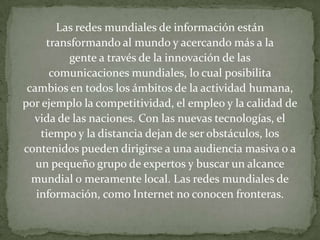 El documento describe las ventajas del comercio electrónico para las empresas y los clientes. Permite a las empresas acceder a mercados globales y reducir costos, mientras que los clientes pueden acceder a más información, comparar productos de manera más fácil y encontrar mejores precios. El comercio electrónico utiliza tecnologías como el intercambio electrónico de datos, correo electrónico, transferencia electrónica de fondos e Internet para facilitar las transacciones comerciales entre empresas y clientes.
