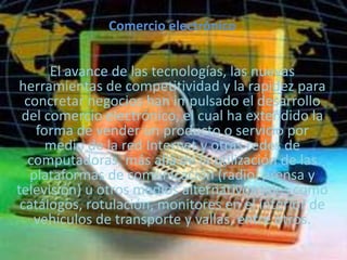 El documento describe el comercio electrónico, incluyendo que ha evolucionado gracias al avance de la tecnología y permite vender productos y servicios en línea de forma rápida. Explica que el comercio electrónico ofrece ventajas como nuevos canales de venta, ahorro de tiempo, y acceso las 24 horas para compradores. También menciona algunas razones para que las empresas usen el comercio electrónico como llegar a nuevos mercados y reducir costos.
