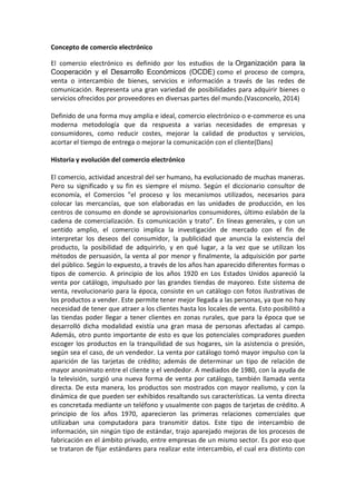 El documento define el comercio electrónico como el proceso de compra, venta o intercambio de bienes, servicios e información a través de las redes de comunicación. Explora la historia del comercio electrónico desde la venta por catálogo en los años 1920 hasta el desarrollo de las primeras transacciones comerciales electrónicas entre empresas en los años 1970. Finalmente, describe cómo una empresa mayorista implementó un sistema de órdenes de pedido electrónicas en los años 1980 que redujo errores y tiempos de procesamiento.