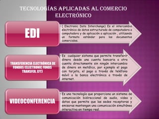 El documento discute el comercio electrónico y cómo las nuevas tecnologías de la información podrían afectar a los intermediarios. Explica los tipos de intermediarios involucrados en el comercio electrónico y las tecnologías aplicadas a este campo.