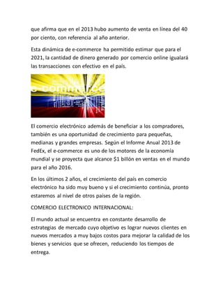 El comercio electrónico consiste en la compra y venta de productos o servicios a través de medios electrónicos como Internet, originalmente aplicado a transacciones electrónicas pero ahora refiriéndose principalmente a la venta en línea usando medios de pago electrónicos. El comercio electrónico nacional en Colombia ha crecido un 40% anualmente y se espera que para 2021 las ventas en línea igualen las transacciones en efectivo, beneficiando a empresas pequeñas, medianas y grandes. El comercio electrónico internacional es actualmente el
