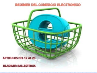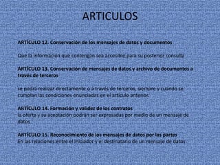 El documento resume los artículos 12 al 23 de un régimen de comercio electrónico. Los artículos tratan sobre la conservación de mensajes de datos y documentos, la formación y validez de contratos electrónicos, el reconocimiento y atribución de mensajes de datos, el envío y recepción de mensajes duplicados, y los efectos jurídicos de los acuses de recibo de mensajes de datos.
