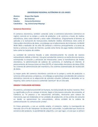 El comercio electrónico, o e-commerce, abarca la compra y venta de productos y servicios a través de medios electrónicos, especialmente Internet, y ha evolucionado significativamente desde sus inicios en los años 90. Este tipo de comercio incluye diferentes transacciones entre empresas y consumidores, ofreciendo ventajas como la reducción de costos, disponibilidad 24/7 y acceso a un mercado global, aunque también presenta desventajas como la falta de confianza en la empresa vendedora y problemas de seguridad en los pagos. A medida que las tecnologías avanzan, el comercio electrónico continúa transformándose y creciendo en popularidad.
