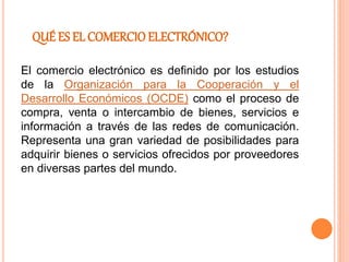 El documento define el comercio electrónico como el proceso de compra, venta o intercambio de bienes, servicios e información a través de redes de comunicación. Explica que representa una variedad de posibilidades para adquirir bienes o servicios de proveedores en diferentes partes del mundo. Además, detalla algunas herramientas y métodos de pago comúnmente usados en el comercio electrónico como PayPal, transferencias bancarias y contra reembolso.