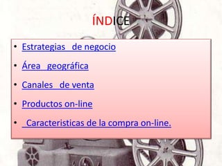 Este documento compara las estrategias de negocio y características de dos cadenas de cines en España, Yelmo Cineplex y Cines Renoir. Ambas promocionan películas y eventos relacionados con el cine para facilitar las ventas de entradas. Yelmo tiene un mayor alcance geográfico y más opciones de compra en línea y tradicional, mientras que Renoir se enfoca más en Madrid y Barcelona. Aunque ambas ofrecen una buena calidad, Yelmo generalmente proporciona un mejor servicio a los consumidores