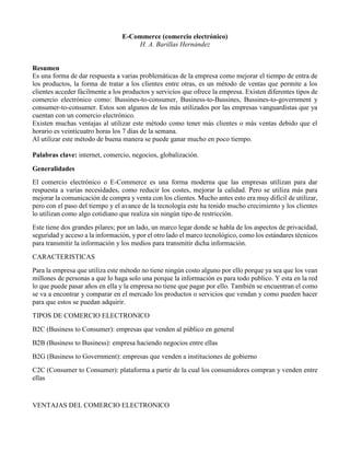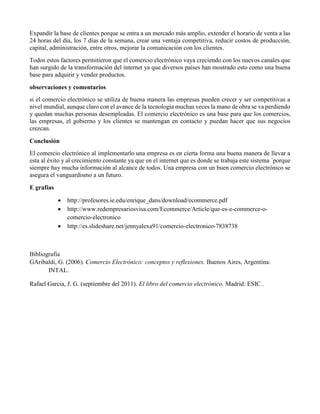 El comercio electrónico es una herramienta esencial para las empresas que buscan mejorar la eficiencia en sus procesos y la comunicación con los clientes, permitiendo un acceso continuo a productos y servicios. Existen varios tipos de comercio electrónico, como B2C, B2B, B2G y C2C, cada uno con ventajas que incluyen la reducción de costos, ampliación de la base de clientes y mejora en la competitividad. La adecuada implementación del e-commerce puede llevar al éxito y crecimiento sostenido de las empresas en un mercado globalizado.
