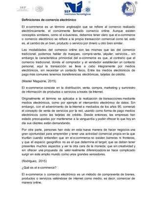 El documento proporciona información sobre el comercio electrónico (e-commerce). Explica que el e-commerce se refiere a la distribución, venta, compra, marketing y suministro de información de productos o servicios a través de Internet. También describe las principales categorías del e-commerce, incluyendo el B2B (business-to-business), B2C (business-to-consumer), y C2C (consumer-to-consumer).