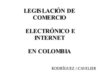 El documento describe la legislación de comercio electrónico en Colombia, destacando los principales actores como el Ministerio de TIC y la Superintendencia de Industria y Comercio. Se mencionan políticas públicas orientadas a masificar el acceso a tecnologías de información y mejorar la protección al consumidor, así como un marco legal que incluye leyes sobre comercio electrónico y protección de datos. También se presentan estadísticas sobre el uso del comercio electrónico y las barreras que enfrenta, con objetivos específicos para fomentar su crecimiento y adaptabilidad en el país.