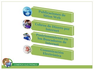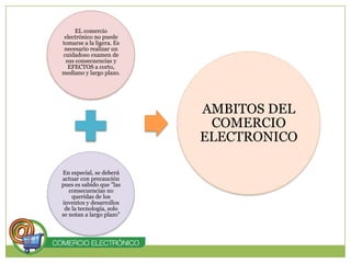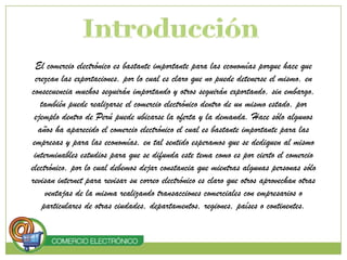 El documento habla sobre el comercio electrónico. Explica que es el comercio que se realiza a través de medios electrónicos como Internet. Describe las clasificaciones de comercio electrónico como B2B (empresas a empresas), B2C (empresas a consumidores) y C2C (consumidores a consumidores). También enumera los elementos necesarios para realizar transacciones de comercio electrónico como una conexión a Internet, un sitio web, un sistema de pago y envío de productos.