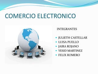 El comercio electrónico implica la compra y venta de productos y servicios a través de medios electrónicos, principalmente internet, y ha evolucionado desde su origen en los años 90. La legislación colombiana relevante, como la Ley 527, regula aspectos como los mensajes de datos, firmas digitales y entidades de certificación, proporcionando un marco legal para su uso. A pesar de un crecimiento reciente, el comercio electrónico en Colombia aún está por debajo de otros países de la región, representando menos del 0,2% del PIB hasta hace poco.