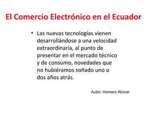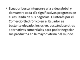 El documento describe el creciente interés en el comercio electrónico en Ecuador. Las nuevas tecnologías están evolucionando rápidamente y permitiendo nuevas formas de negocios en línea. Aunque Ecuador busca integrarse a la economía global digital, todavía existen desafíos de seguridad e incertidumbre jurídica al negociar productos y servicios fuera del país. Los proveedores de internet ecuatorianos ahora ofrecen servicios avanzados para satisfacer la demanda de comercio en línea.