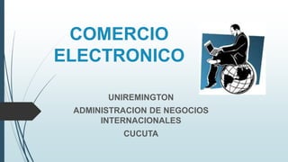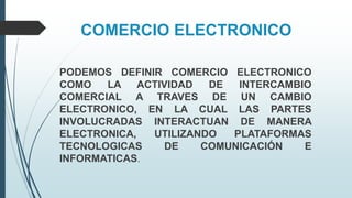 El documento define el comercio electrónico como la actividad de intercambio comercial a través de un medio electrónico, en la que las partes interactúan de manera electrónica utilizando plataformas tecnológicas de comunicación e informáticas. Explica que el comercio electrónico ha existido desde la década de 1920 a través de catálogos y tarjetas de crédito, y se desarrolló con los sistemas de intercambio electrónico de datos en los años 60 y la creación de Internet en los años 80 y 90