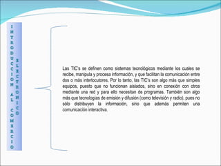 Las TIC se definen como sistemas tecnológicos que facilitan la recepción, manipulación y procesamiento de información para permitir la comunicación entre dos o más interlocutores de forma interactiva. La masificación de Internet en los años 90 se debió al desarrollo de computadoras personales, sistemas operativos más amigables y mejoras en los módems. Internet ha crecido exponencialmente desde 50 portales en 1992 a casi 40 millones actualmente.