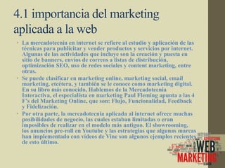 El documento habla sobre el marketing aplicado a las páginas web y el comercio electrónico. Explica la importancia del marketing digital, las 4 F del marketing online, y cómo el marketing en internet ofrece nuevas posibilidades de negocio. También define conceptos claves como las 4 P del marketing (producto, precio, plaza y promoción) y la administración de la relación con el cliente. Por último, introduce el tema de las redes sociales y cómo representan las estructuras sociales.