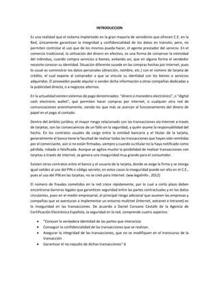 Este documento discute los problemas de seguridad y privacidad asociados con el comercio electrónico. Señala que aunque ha mejorado la seguridad de las transacciones en línea, muchos usuarios aún desconfían de proveer sus datos financieros en Internet debido al riesgo de fraude. También menciona otras desventajas como la falta de contacto directo con los vendedores y la dificultad de reclamar después de una compra. Sin embargo, concluye que a pesar de estos riesgos, el comercio electrónico eventualmente re
