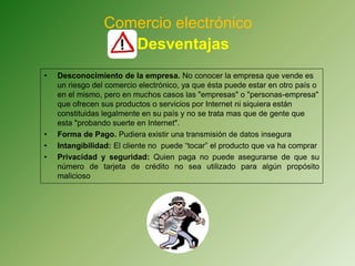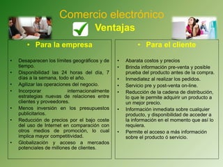 El documento describe las ventajas del comercio electrónico para las empresas y los clientes. Para las empresas, elimina las barreras geográficas y de tiempo, permite operar las 24 horas todos los días del año, agiliza las operaciones, reduce los costos de publicidad e internacionaliza las estrategias. Para los clientes, reduce los costos y precios, brinda información previa al producto, permite comprar de forma inmediata y acceder a servicios en línea.