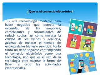 El documento define el comercio electrónico y describe sus características, tipos y aplicación en las empresas. Define el comercio electrónico como una metodología moderna para hacer negocios que mejora la eficiencia reduciendo costos y tiempos de entrega. Describe sus características como la ubicuidad, alcance global, estándares universales e interactividad. Explica los tipos como B2C, B2B, C2C y P2P y cómo se aplica en las empresas generando procesos más planos y necesitando continua capacit