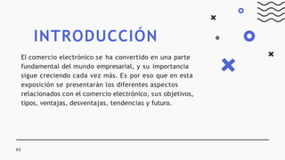 El documento presenta información sobre el comercio electrónico. Explica que el comercio electrónico ha permitido a las empresas llegar a más clientes de manera global y ha aumentado la conveniencia para los consumidores. También describe los diferentes tipos de comercio electrónico como B2B, B2C, C2C y C2B. Resalta que el comercio electrónico fue fundamental durante la pandemia de COVID-19 para mantener la economía en funcionamiento permitiendo compras seguras desde casa.