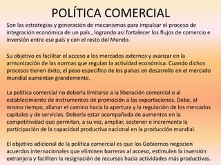 La política comercial tiene como objetivo facilitar el acceso a mercados externos y armonizar normas para aumentar la participación de los países en desarrollo en el comercio mundial. No solo debe enfocarse en la liberalización comercial y promoción de exportaciones, sino también en abrir mercados de capitales y servicios para ampliar y sostener la producción nacional en el mercado global. Los gobiernos deben negociar acuerdos para eliminar barreras, estimular inversión extranjera y asignar recursos a actividades más productivas.