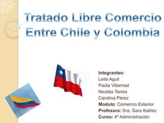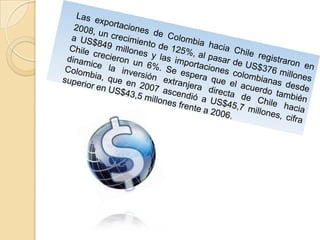 El documento describe el Tratado de Libre Comercio entre Chile y Colombia firmado en 2006, el cual elimina aranceles para el 98% del comercio entre los países. El tratado tiene como objetivo crear un espacio económico ampliado que permita la libre circulación de productos, servicios e inversiones. Desde que entró en vigor, el comercio exterior entre los dos países ha aumentado significativamente.