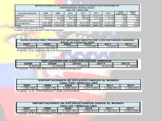 El documento resume las ventajas y desventajas del comercio exterior, explica los conceptos y procesos de la negociación comercial, y describe las características de un buen negociador. Luego, detalla cómo las TIC han facilitado el comercio exterior y menciona algunos países con los que Ecuador comercia, incluyendo a Estados Unidos y Suiza, así como a la Alianza Bolivariana para los Pueblos de Nuestra América.