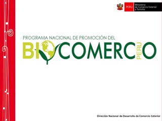 El documento describe la historia y desarrollo del biocomercio en Perú desde 2001 hasta 2012, incluyendo la creación de comités, elaboración de diagnósticos y proyectos piloto, y la aprobación del Programa Nacional de Promoción del Biocomercio. Se detalla la estructura organizativa del programa y las instituciones involucradas en la promoción del biocomercio en el país.