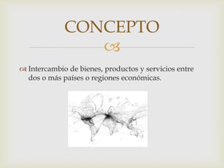 El documento resume los conceptos y modelos clave del comercio internacional. Explica que el comercio internacional implica el intercambio de bienes y servicios entre países. Luego describe las teorías tradicionales como la ventaja absoluta de Adam Smith y la ventaja comparativa de David Ricardo. También cubre modelos como el librecambismo y el proteccionismo, así como políticas proteccionistas como los aranceles, el dumping y las barreras no arancelarias.