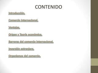 Este documento describe el comercio internacional, incluyendo sus ventajas, barreras y organismos involucrados. Explica que el comercio internacional es el intercambio de bienes entre naciones y surge de la distribución irregular de recursos. También cubre la inversión extranjera directa e indirecta y los organismos públicos y privados mexicanos relacionados con el comercio exterior como SECOFI, SHCP y PROMEXICO. Concluye enfatizando la importancia de entender el comercio internacional para tener éxito en los negocios