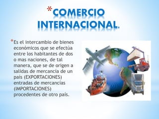 El documento trata sobre el comercio internacional. Explica que es el intercambio de bienes económicos entre dos o más naciones, lo que genera exportaciones e importaciones. Sus orígenes se remontan al intercambio entre países tropicales y zonas templadas. El comercio internacional ha ido creciendo debido a mejoras en el transporte e incremento del capital. Presenta las ventajas y barreras al comercio internacional, así como instrumentos para fomentar las exportaciones.