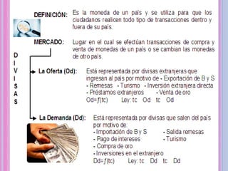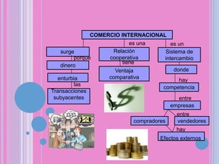 El documento habla sobre el comercio internacional entre países. Define el comercio internacional como el intercambio de bienes, productos y servicios entre dos países, uno exportador y otro importador. Las economías que participan en el comercio exterior se denominan economías abiertas. El comercio internacional surge por la ventaja comparativa y hay transacciones subyacentes entre empresas compradoras y vendedoras de diferentes países.