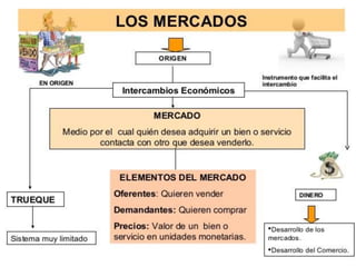 El documento habla sobre conceptos básicos de comercio internacional. Define el mercado como el espacio donde ocurren transacciones entre oferta y demanda. Explica los tipos de intercambio (directo e indirecto) y define exportaciones e importaciones. También cubre conceptos como necesidades, escasez y sectores externos.