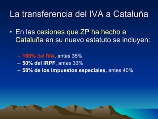 Este documento argumenta que la transferencia del 100% del IVA a Cataluña es injusta porque significa que los impuestos de otras regiones se destinan a la cuarta región más rica de España. Se anima a los lectores a hacer "comercio justo" comprando productos de empresas con sede fuera de Cataluña para que los impuestos se destinen a quienes más lo necesitan en toda España.