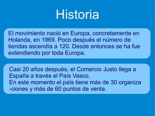 El documento describe el comercio justo, un sistema comercial que promueve una relación justa entre productores y consumidores. Sus objetivos incluyen garantizar salarios justos para los productores, mejorar las condiciones de trabajo y proteger los derechos humanos y el medio ambiente. Los productos más vendidos son alimentos como café, té y chocolate. El documento también menciona algunas organizaciones de comercio justo en Bilbao, España.