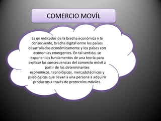 El documento describe la evolución del comercio móvil y la publicidad móvil. Explica que los primeros teléfonos móviles eran grandes y caros, pero que la tecnología mejoró reduciendo el tamaño y precio para hacerlos más accesibles. También cubre cómo empresas como Google y Yahoo usan publicidad en sitios web móviles y cómo las marcas usan MMS para enviar contenido multimedia a los usuarios. Finalmente, da el ejemplo de una campaña de Gillette que permitía a los usuarios de iPhone afeitarse virtualmente y