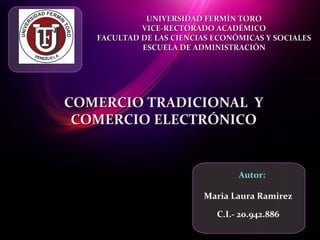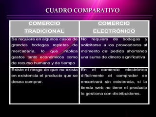 El documento compara el comercio tradicional y el comercio electrónico, destacando que el comercio tradicional requiere de grandes bodegas y existe el riesgo de falta de existencias, mientras que el comercio electrónico no requiere bodegas y es poco probable que falten productos. También contrasta las formas de pago, atención al cliente, y expansión de cada modelo comercial.