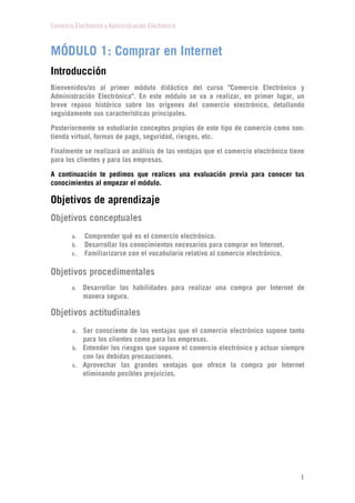 El módulo 1 del curso sobre comercio electrónico y administración electrónica ofrece una introducción sobre la evolución histórica y características del comercio electrónico, así como consejos para realizar compras seguras en internet. Se abordan temas como tipos de tiendas virtuales, métodos de pago, riesgos, y precauciones que deben tener en cuenta los consumidores. El módulo destaca las ventajas del comercio electrónico tanto para clientes como para empresas, enfatizando su accesibilidad y eficiencia.