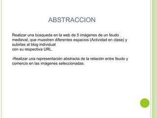 El documento instruye realizar una búsqueda de 5 imágenes de feudos medievales que muestren diferentes espacios, subirlas a un blog individual con sus URLs correspondientes, y luego crear una representación abstracta de la relación entre feudo y comercio basada en las imágenes seleccionadas. Incluye 5 enlaces de imágenes de feudos medievales encontradas en la web.