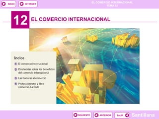 El documento describe el comercio internacional. Explica que se debe a la desigual distribución de recursos, diferencias de costos de producción y gustos de consumidores entre países. También habla sobre la ventaja comparativa y cómo cada país se especializa en lo que puede producir a menor costo. Finalmente, discute las barreras al comercio como aranceles y medidas no arancelarias, y el debate entre libre comercio y proteccionismo.