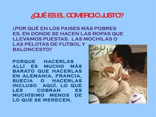 El documento describe el comercio justo, que busca pagar precios justos a los trabajadores en países pobres que producen bienes como ropa, mochilas y pelotas de fútbol. Actualmente, estos trabajadores reciben mucho menos de lo que merecen. El comercio justo también busca acercar a los trabajadores y compradores eliminando intermediarios y usar los mayores ingresos para mejorar la calidad de vida con cosas como escuelas y agua potable. Las organizaciones no gubernamentales, Estados Unidos y movimientos sociales apo