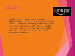 El documento describe cinco exitosos comercios electrónicos: Amazon, Dell, eBay, ThinkGeek y Staples. Amazon es probablemente la plataforma de comercio electrónico más conocida y ha tenido éxito al permitir que otros vendan en su sitio web y ofreciendo una gran variedad de sus propios productos. Dell también es ampliamente conocida por ordenadores y tiene un exitoso comercio electrónico con descuentos y optimización para compradores. eBay permite subastas de todo tipo de productos y que personas vendan directamente, incluyendo prote