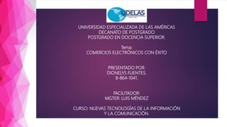 El documento habla sobre los comercios electrónicos y su éxito. Define el comercio electrónico como un modelo de negocio que realiza transacciones a través de Internet sin tiendas físicas. Luego menciona algunos ejemplos exitosos como Amazon, que permite a otros vender productos en su sitio, y también ofrece los propios; Staples y Dell, conocidos por su diseño limpio y gran variedad de productos; y Ebay y ThinkGeek, que ofrecen subastas y gadgets respectivamente.