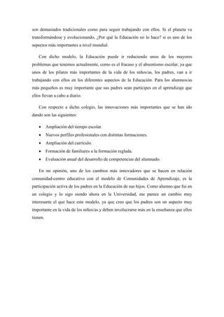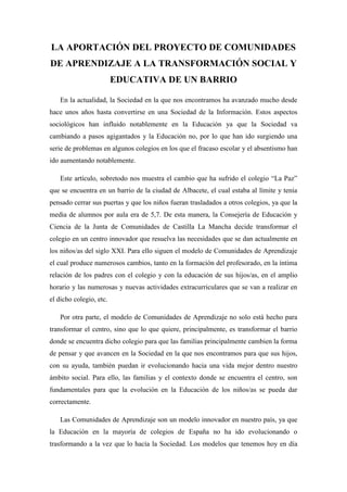 Este documento describe cómo el modelo de Comunidades de Aprendizaje transformó la escuela "La Paz" en Albacete, España. La escuela estaba en declive con solo 5.7 estudiantes por aula y planeaba cerrar. El modelo transformó la escuela a través de una mayor participación de los padres, una ampliación del horario escolar y el currículo, y nuevos perfiles de profesores. El modelo también busca transformar el barrio para que las familias ayuden a sus hijos a evolucionar en la sociedad. La participación activa de los