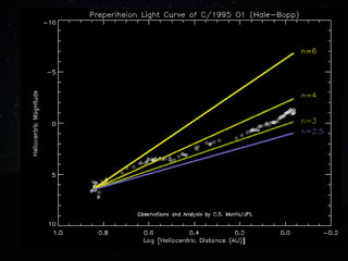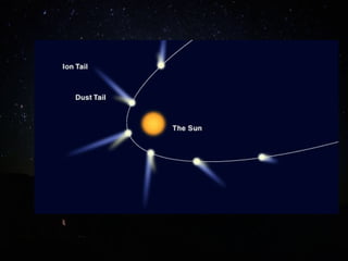 Este documento describe los diferentes tipos de cometas, incluyendo sus características orbitales y composición. Explica que los cometas de corto período provienen del cinturón de Kuiper mientras que los de largo período provienen de la nube de Oort. Además, detalla la estructura típica de un cometa con su núcleo, coma y colas, y los procesos físicos y químicos involucrados en su formación y actividad. Finalmente, presenta varios métodos para estudiar y observar come