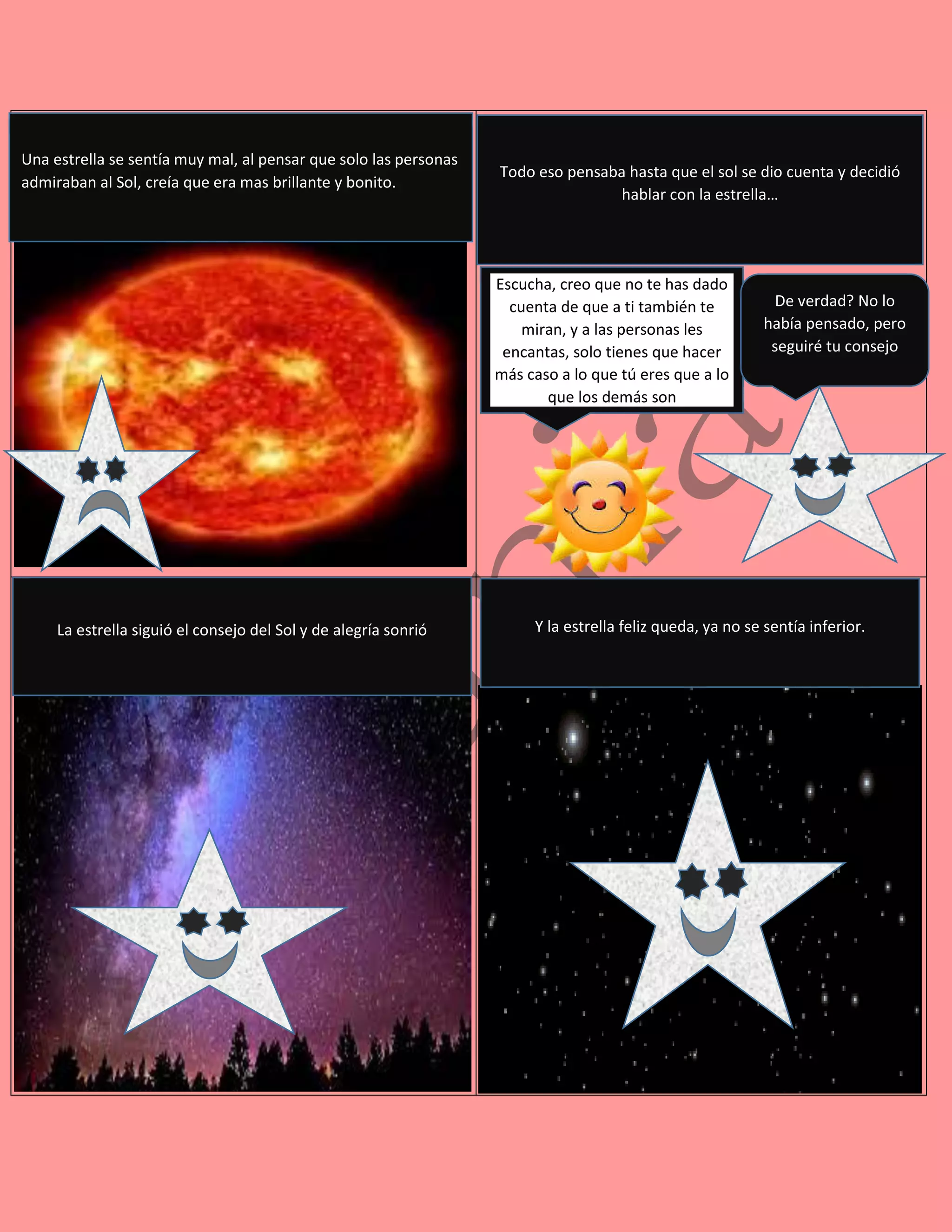 Una estrella se sentía insegura porque pensaba que las personas solo admiraban al sol y no a ella, pero el sol la animó diciéndole que a ella también la miraban y les encantaba, y que no debía compararse con los demás. La estrella siguió el consejo del sol, dejó de sentirse inferior y fue feliz.
