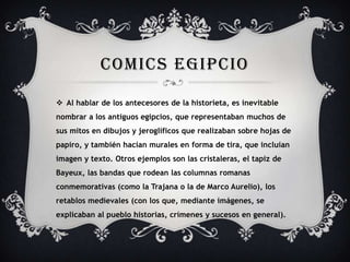 El documento resume brevemente la historia de los cómics en Egipto, Brasil y Bolivia. Los antiguos egipcios representaban mitos en dibujos y jeroglíficos sobre papiro. En Brasil, las historietas se conocen como "quadrinhos" y su fecha fundacional fue 1869 con la publicación de "Las aventuras de Nhô-Quim". En Bolivia, las revistas más importantes surgieron a mediados del siglo XX, como "Cascabel" creada en 1961. Finalmente, se menciona que los superhéroes de DC Comics