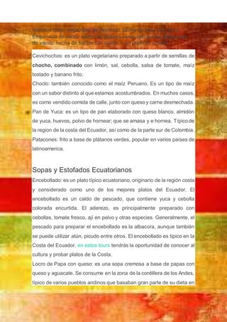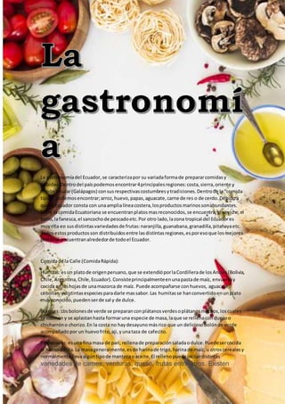 La gastronomía ecuatoriana varía según las 4 regiones principales del país (costa, sierra, oriente e islas Galápagos). Platos típicos incluyen arroz, papas, carne y mariscos debido a la línea costera. Algunos platos reconocidos son ceviche, fanesca y sancocho de pescado. Las frutas tropicales como naranjilla y guanábana también son abundantes. La comida callejera incluye humitas, bolones, empanadas, cevichochos, choc